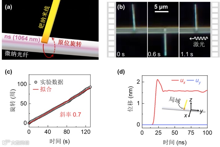 纳米线的横向尺度只有几百nm,在声子平均自由程附近,因此在这个方向上使用弹性力学并不太合理,相关的模拟结果可信度较低。虽然横向质心位移ūa显示了一个较小的值,表明纳米线有较小的横向位移(图2c),但这个结果应该舍弃。从这个角度来看,只要纳米线轴与光纤轴垂直,就可以消除纳米线的横向移动,在实验中纳米线与微纳光纤的轴线垂直时,确实可以实现原位旋转。如图3所示,使用脉宽5 ns,重复频率为4 kHz的1064 nm纳秒脉冲激光。一根长10.7 μm的钯纳米线在直径1.2 μm的微纳光纤的一个固定横截面上连续旋转。纳米线轴线与超细纤维轴线垂直,旋转持续2分钟。平均线性旋转速度为2.7 μm/s,相当于0.7转/秒。纳米线在一个脉冲中移动的步长为0.67 nm,旋转角为3.8 arcmin。利用旋进运动相同的运动简化,计算得到动力为0.07 μN,质量为2.6 pg(截面200 nm×100 nm),纳米线转矩为0.07 pNm,转矩质量比为0.027 Nm/g。