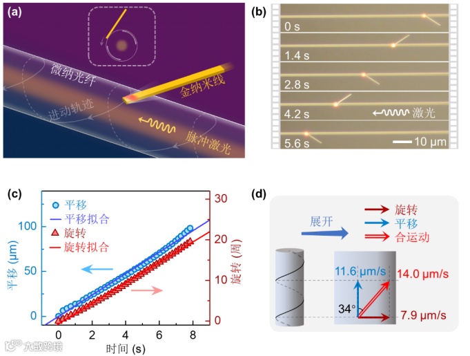 如图1所示,微纳光纤通入脉冲激光使,放在光纤表面的钯纳米线被激发,产生光热冲击,纳米线沿着微纳光纤轴螺旋进动。该进动可以持续8秒,进动总距离可达 0.1 毫米。纳米线马达的旋转和平移相关的实验数据都具有良好线性,显示了进动的稳定性(图1c)。展开微纳纤维侧面,纳米线马达进动可以分解为轴向平移和绕轴旋转(图1d),合速度为 14.0 μm/s,轴向平移和圆周旋转分速度分别为 11.6 μm/s 和 7.9 μm/s (相当于每秒 2.5 圈),进动螺旋角约34°。单脉冲驱动下的位置分辨率和旋转角度分别计算为 0.58 nm 和 2.3 arcmin。纳米线的扭矩质量比可计算为 0.29 Nm/g,扭矩为 0.73 pNm。