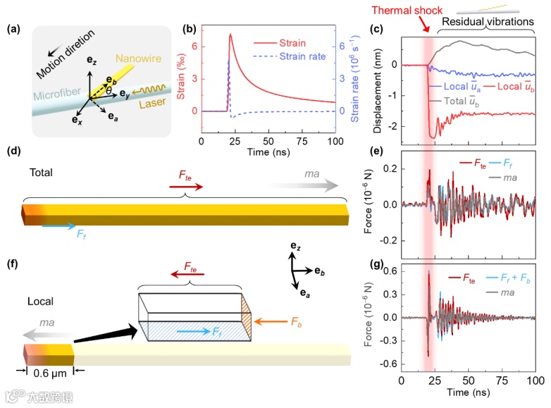 Fte和Ff在运动方向上分量值大致相等,满足于散度定理,它们的值也等于质量乘以加速度得出的动力值,这与牛顿运动第二定律相符(图2e)。但是整根纳米线的质心位移ūb方向与实验结果不一致(图2c,灰色),ūb由以下给出,