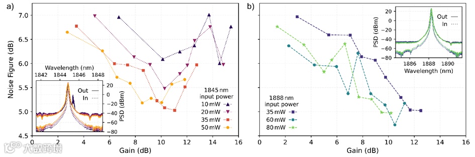 图3. a)和 b)分别为在1845纳米和1888纳米处,不同芯片上种子功率下噪声系数与增益的关系。插图显示输入和放大输出信号光谱(当净增益接近16分贝时,在1845纳米附近用10毫瓦种子功率可看到寄生激光尖峰)。
