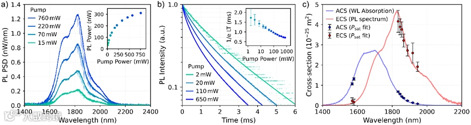 图4. a)不同泵浦功率下的光致发光(PL)光谱。插图显示积分PL功率与泵浦功率的关系。b)相对于泵浦功率的 PL时域轨迹。插图显示1/e寿命(信号从峰值下降63.2%所需的时间)。c)增益薄膜的测量和外推的发射截面和吸收截面。