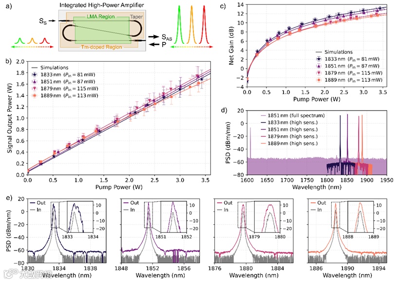 图2. a)反向传播方案示意图 。b)对于从1.83微米到1.89微米调谐的信号,种子激光器的放大信号输出功率与耦合泵浦功率的关系,芯片上种子输入功率范围从81毫瓦到115毫瓦。c)净增益与泵浦功率的关系。d) 种子激光器的宽带光谱显示在泵浦光和信号之间存在可忽略的放大自发辐射(ASE)基底。e)放大输出(在净增益为10-12分贝时测量)和从1830纳米到1890纳米的输入信号的光谱测量的混合电光腔特征和主动电光腔设计原理的理论建模。