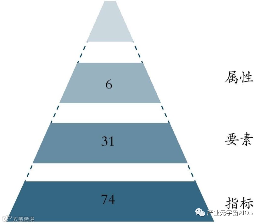 Giffinger教授在智慧城市模型构建的规范研究中,确立了层级指标体系的结构以确保可行性,提出了6个智慧城市的属性,每个属性下辖数个要素,而这些要素进一步是由数个指标综合构成的。