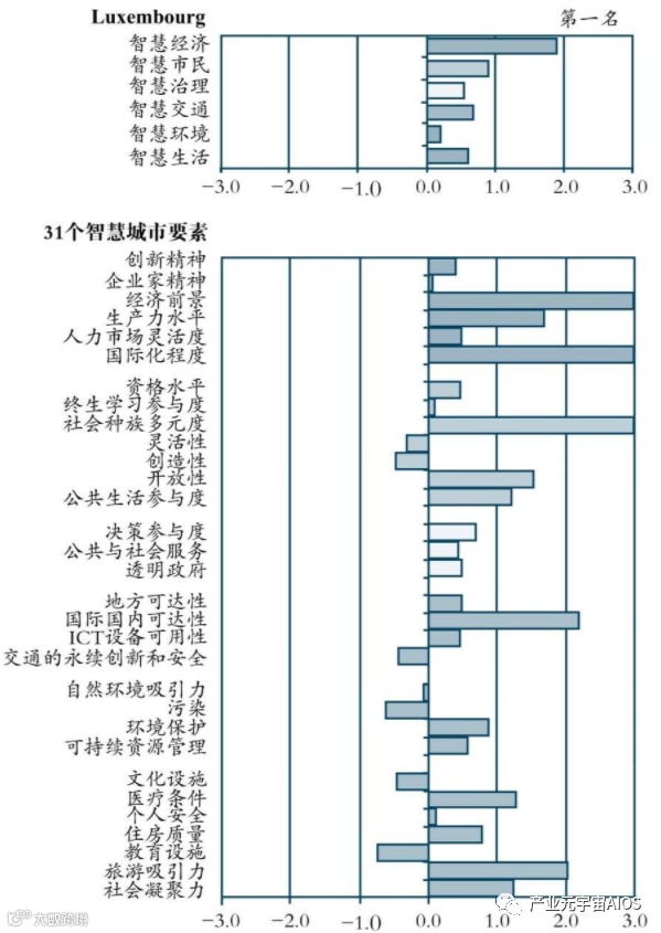 比如在对第一版排名第一的卢森堡的各方面要素进行总结时,可以看到,卢森堡在智慧市民属性下的灵活性和创造性、在智慧生活下的教育设施等指标还存在很大不足,这是其城市发展的短板(见图A6)。