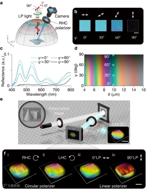 根据上述方程,研究人员发现入射光偏振角和结构色亮度呈一一对应关系。因此,结构色亮度的独立调控为微半球提供了一个携带高维信息的新自由度。研究人员进一步设计了一幅具有立体感和层次感的素描图案来展示微半球结构色材料在立体显示和机器视觉领域的应用潜力(图3e,f)。