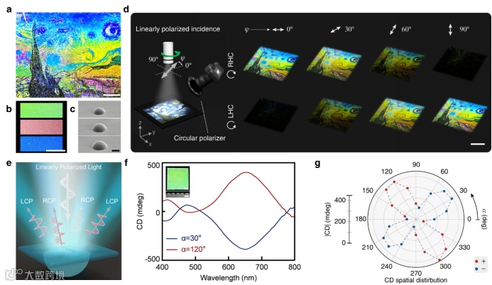 除了结构色外,研究人员经过仔细观察发现微半球在线偏振光的照射下展现出显著的圆二色性(Circular dichroism,CD),并且这种手性响应依赖于入射光的偏振方向(图1d)。研究人员进一步采集了微半球的CD光谱,结果表明微半球不仅具有强烈的CD响应信号(CD值约为400 mdeg),而且在不同的方位角上具有不同的CD信号强度和CD符号(图1f-g)。这些结果表明微尺度半球形结构不仅具有手性光学响应,并且它的手性光学特征呈各向异性。