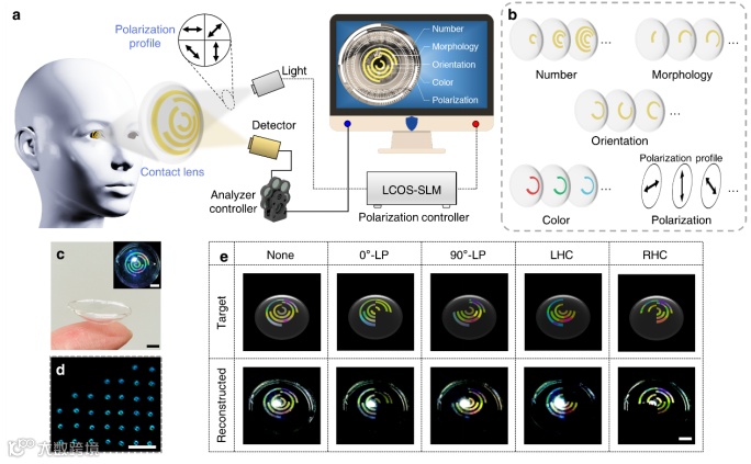 为了进一步突出基于微半球的加密技术的应用潜力,研究人员模仿基于虹膜的身份识别系统,提出了将微半球与隐形眼镜集成来实现新型身份认证的策略(图5)。研究人员通过设计同心圆弧的数量、形貌、取向、颜色和偏振,成功实现了五重加密功能。计算结果表明,同心圆弧的数量、形貌、取向、颜色和偏振都是4种类型的情况下,即可实现232种编码容量。这些结果表明,将微半球集成到隐形眼镜中,可以为提升个人身份信息安全开辟新的途径,并有可能通过整合不同的光学元件来实现人机交互。