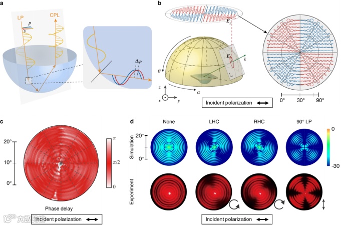 线偏振光在微半球中发生一次全内反射后,它的s分量和p分量会分别产生一个相位变化(图2a)。由于两者的相位变化不同,导致两个分量之间产生了相位差Δδ。因此,当线偏振光经过多次全内反射后,s分量和p分量的累积相位差达到±π/2,并且他们的振幅相等时,出射光就转变成了圆偏振光。研究人员通过理论计算和实验验证,进一步绘制了反射光偏振态的空间分布(图2b-d)。