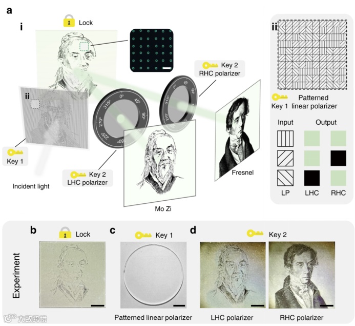 由于微半球的色调和亮度对其形态和入射偏振方向非常敏感,因此可以通过设计微半球的排列和入射光的偏振角来编码不同的信息(图4)。研究人员以墨子和菲涅尔肖像作为加密对象,通过设计图案化的微半球以及起偏镜,将两幅肖像编码分别到两个正交的圆偏振通道中。由于加密信息被物理拆分成三个部分,因此无法从微半球或者起偏镜中获取有用的信息。另外,由于人眼无法识别偏振光,因此在解密的过程中,还需额外使用检偏镜,来进行解密。因此,提出的微半球加密策略为信息安全提供了多级保护,大大提高了解密的难度。