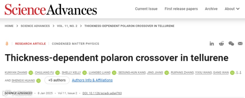 近日,Science Aadvances在线发表了莱斯大学Shengxi Huang(黄声希)课题组联合麻省理工学院Mingda Li(李明达)课题组及一批研究者的研究论文,题目为「Thickness-dependent polaron crossover in tellurene」,论文的第一作者为Shengxi Huang课题组的博士毕业生Kunyan Zhang和Mingda Li课题组的Chuliang Fu。