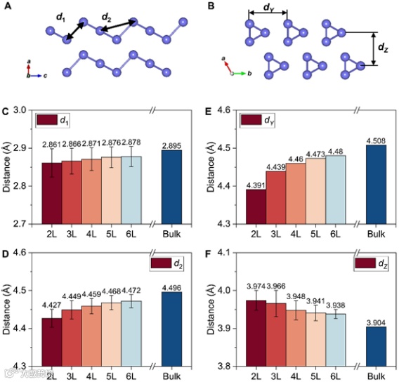 图5. 通过第一性原理计算得出的链内和链间距离。(A)单链中最近Te原子间的距离d1和次近Te原子间的距离d2的示意图。(B)水平链间距离dY和垂直链间距离dZ。(C至F)通过第一性原理计算得出不同层数的碲烯的链内距离(C)d1和(D)d2,以及链间距离(E)dY和(F)dZ。误差条表示一个晶胞内的标准差。