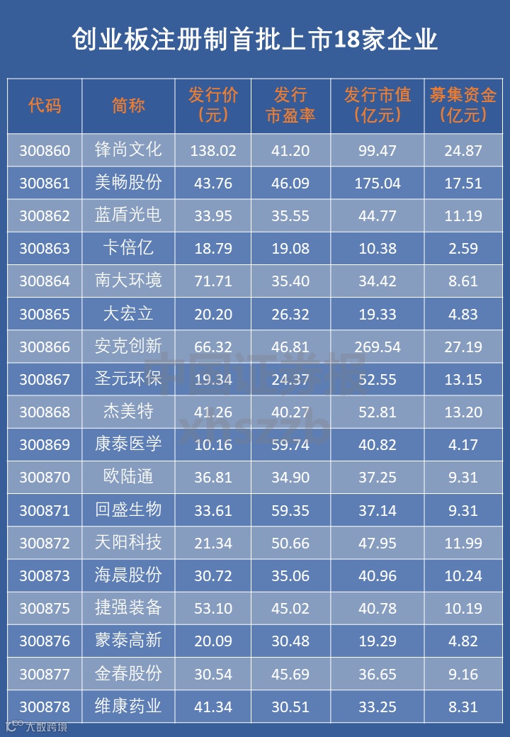 创业板注册制首批上市企业共18家。深交所新闻发言人此前表示,从18家企业新股发行情况看,市场化的发行定价机制有效发挥作用。