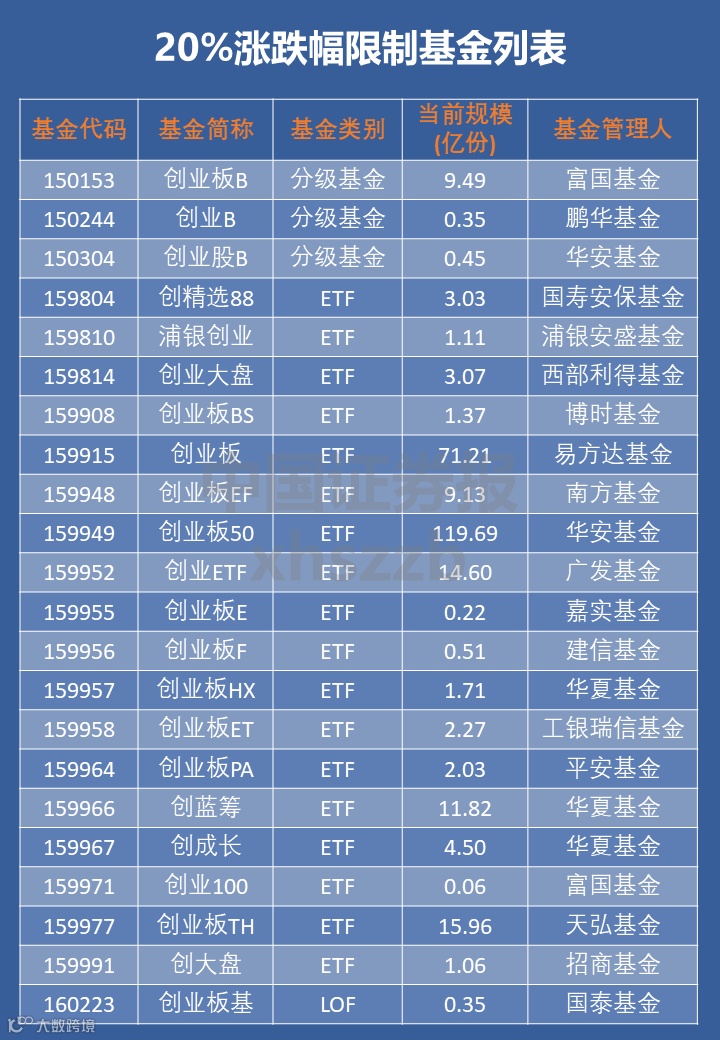 此外,创精选88、浦银创业、创业大盘等22只创业板基金,自8月24日起涨跌幅限制比例也将提高至20%。