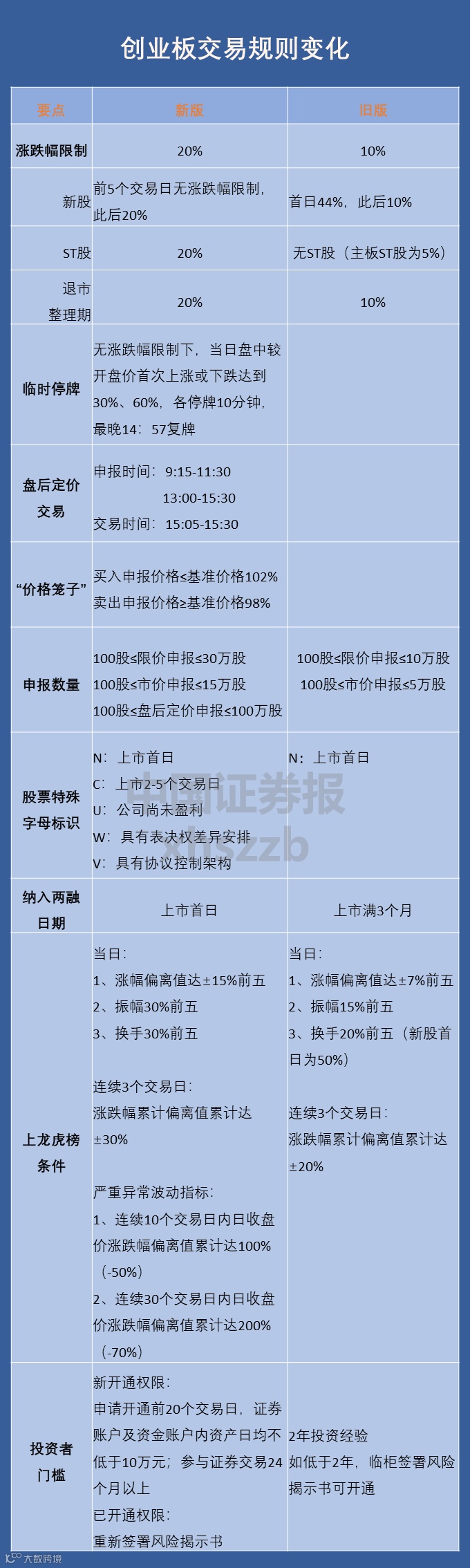 创业板交易规则的新变化,具体包括:涨跌幅限制提高至20%、设置临时停牌机制、实施盘后定价交易、增加连续竞价期间“价格笼子”、设置单笔最高申报数量上限、调整交易公开信息披露指标、优化两融交易机制、新增股票特殊标识等。