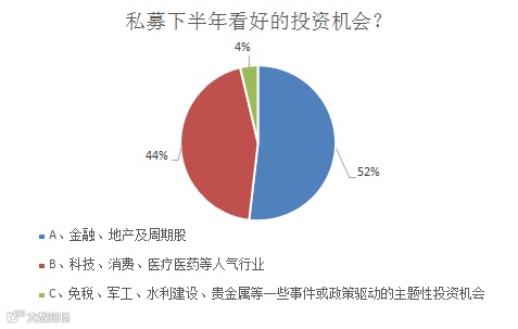 下半年,私募看好的投资领域方面,则主要集中在两大方向:一是金融、地产及周期股,二则依旧是科技、消费、医疗医药等人气行业。看好水利建设、免税、军工等主题性投资机会的私募占比,仅有4%。