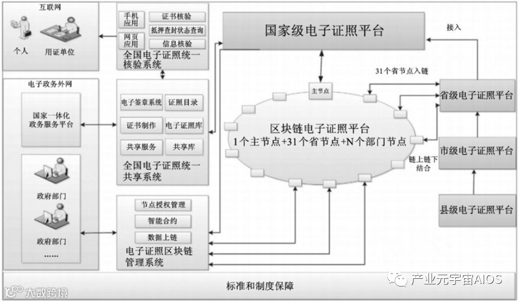 依托区块链技术去中心化同步记账、身份认证、数据不可篡改等特性,在一个链条上,接入政府各职能部门,共同组成电子证照区块链网络,打造了“三上两验一查”的电子证照开放体系及信任环境。