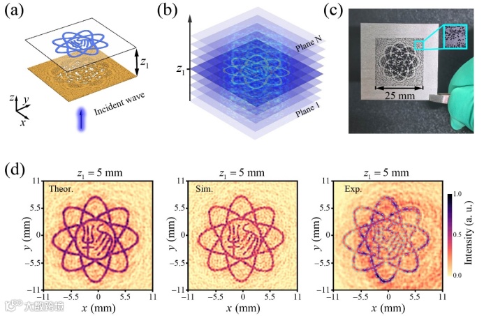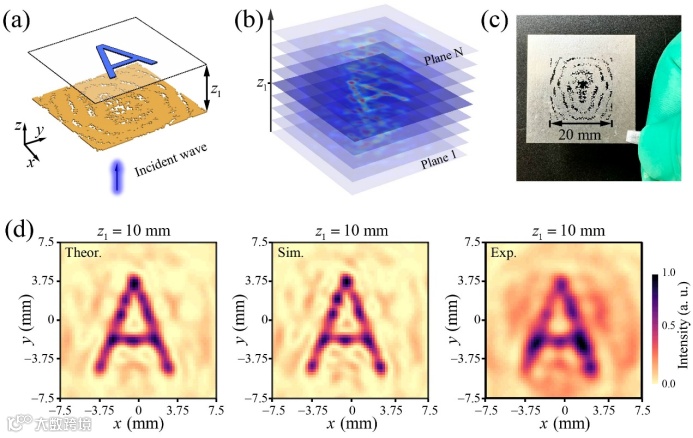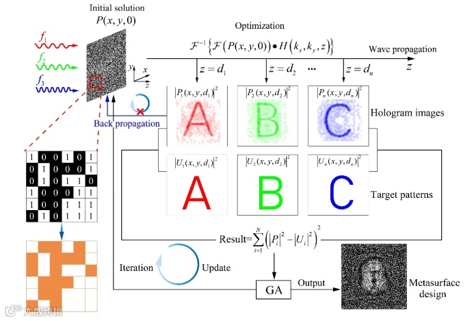 在本研究中,我们提出了一种基于高像素二进制超表面的通用方法,用于实现高分辨率的多维声全息。为实现这一目标,我们采用前向优化策略,利用角谱法计算像面上的声场分布,并通过遗传算法对比像平面与目标平面之间的声场差异,反复迭代直至收敛(图1)。