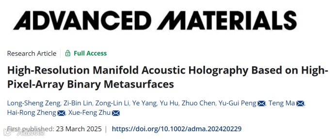 所提出的超构表面能够同时支持多个频率和多个深度的编码,极大地提升了振幅型全息超表面的信息容量。相关成果以“High-Resolution Manifold Acoustic Holography Based on High-Pixel-Array Binary Metasurfaces”为题,发表在《Advanced Materials》期刊上,并被选为封面文章(inside back cover)。华中科技大学博士研究生曾龙生为第一作者,华中科技大学博士研究生林梓彬、中国科学院深圳先进技术研究院博士后李宗霖和副研究员杨晔为共同第一作者。华中科技大学祝雪丰教授和彭玉桂副教授、中国科学院深圳先进技术研究院郑海荣院士和马腾研究员为论文的共同通讯作者,华中科技大学为论文的第一完成单位。
