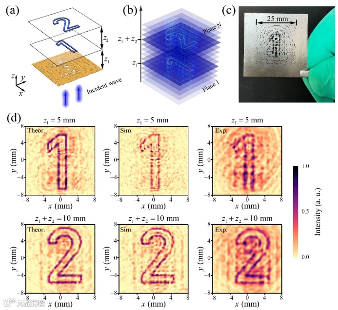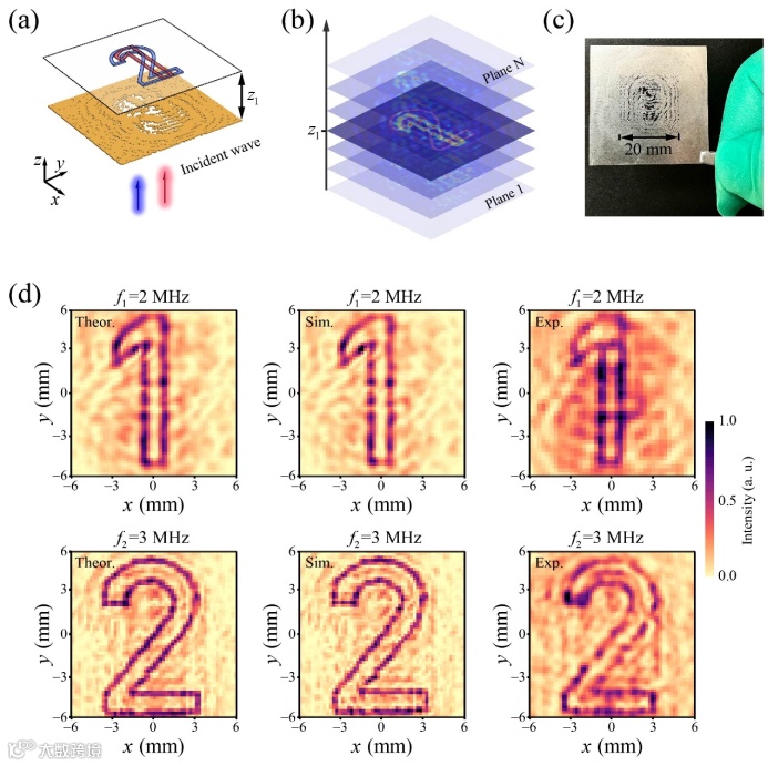 图3. 双深度单频率声全息图案重建。相同频率的入射声波在两个不同深度位置分别形成数字“1”和数字“2”的全息图案,展示了单频率下的多层信息复用能力。