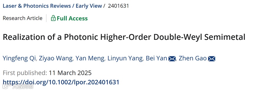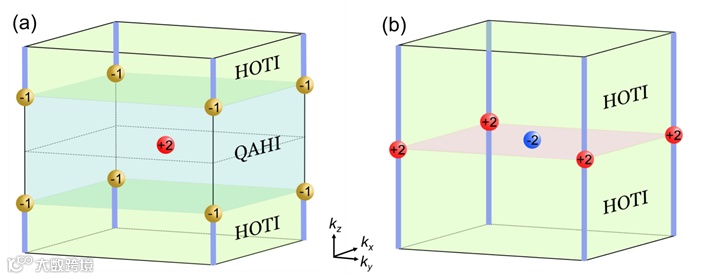 图2 a) 四重螺旋操作的光子高阶双外尔半金属的单胞。黄色(灰色)区域表示金属开口谐振环(介电材料)。b)光子高阶双外尔半金属的俯视图。