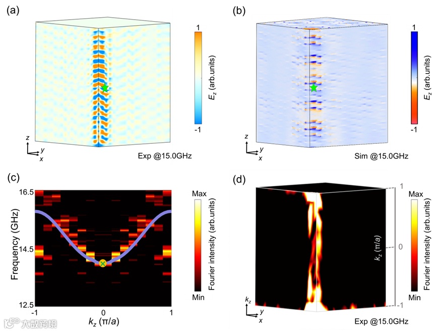 图4 a)测量和b)模拟15.0 GHz时拓扑棱态电场分布,源天线(绿色星)位于棱中间。c)沿着kz方向测量(色图)和模拟(紫色曲线)拓扑棱态色散。带x的黄色点表示拓扑结点在kz = 0处断开。d) 15.0 GHz时测量棱态周围kz变化的傅里叶能量强度。