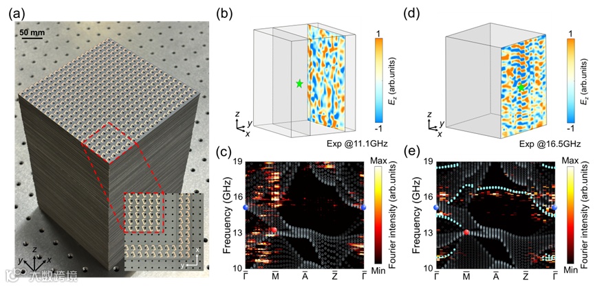 图3 a)实验样品的照片。插图显示了放大后的样品的前四层。b) 11.1 GHz时体态的实测电场分布。绿色星号代表点源。c)实测(色图)和模拟(灰色圆圈)投影体带色散。红色和蓝色球代表电荷为2的外尔点。d) 16.5 GHz时(100)表面拓扑表面态的实测电场分布。e)测量(色图)和模拟(青色点)拓扑表面态在(100)表面上的投影色散。灰色圆圈表示模拟的体带色散。