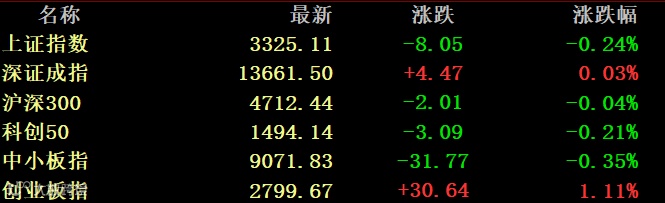 今日早盘,三大股指一度均跌超2%,但全天呈现先抑后扬走势。截至收盘,上证指数微跌0.24%,创业板指和深证成指双双翻红,分别涨1.11%和0.03%。两市成交连续16个交易日突破1万亿。
