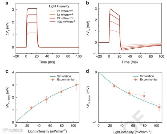 研究明确了 MTP2 分子在光刺激下,其偶极矩的变化是驱动离子跨膜重新分布从而改变膜电位的关键因素。基于这一核心机制,创新性地构建了数学模型,该模型巧妙地将 MTP2 的光异构化动力学过程与膜电位的动态调控紧密联系起来,成功地重现了在不同光强度下细胞膜电位随时间的演变过程,通过图 3 可直观看到模型对膜电位变化的模拟与实验数据对比,理论与实验观测数据高度吻合,充分验证了模型的准确性和可靠性。