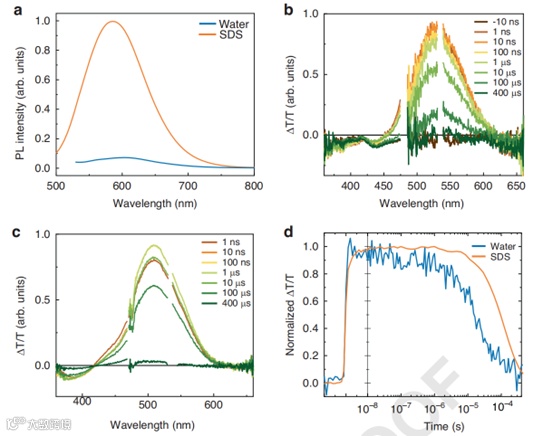 图1. MTP2 在水和 SDS 胶束悬浮液中的稳态和瞬态光谱