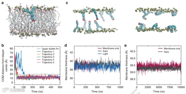 此外,研究团队运用先进的光学光谱技术与精细的分子动力学模拟相结合的方法,对 MTP2 分子进行了全面深入的研究。在光物理特性方面,稳态和瞬态光谱技术的应用揭示了MTP2在不同环境中的光吸收、发射及电荷转移特性,深入阐释了溶剂极性对分子能级结构和光物理过程的影响机制,极大地丰富了对推拉型偶氮苯光物理性质的理解。如图2,分子动力学模拟则精确呈现了MTP2分子在细胞膜内的自发插入、稳定分布以及与膜脂质分子的相互作用细节,明确了其在膜内的取向和运动行为,证实了MTP2对细胞膜结构无显著影响,这与传统分子如Ziapin2 形成鲜明对比。这些研究成果填补了此前在光刺激分子与细胞膜微观相互作用机制方面的认知空白,为深入理解细胞光刺激的物理化学过程提供了关键依据。