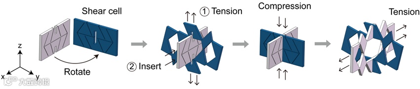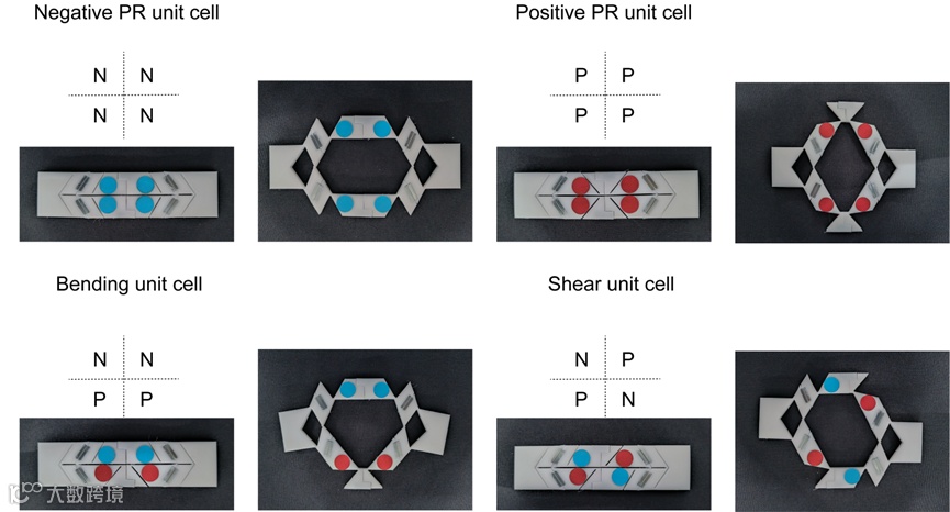 区别于现有的双稳态单元设计,研究团队使用具备统一拓扑图案的基本剪纸胞元,通过参数控制泊松比特性,结合多种阵列组合方式,得到了具备多模式变形功能的双稳态剪纸单元,其分别表现为负、正泊松比,及平面拉伸驱动的弯曲、剪切变形。研究还提出了一种基于磁铁基本模块的可以快速拆卸和重新组装的单元设计,将剪纸单元的最小构成胞元向构建块层级转移,可以实现多种单元之间的快速切换重组,如图1和视频1所示。