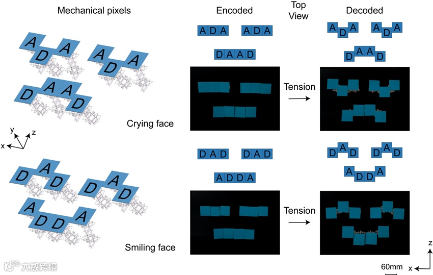视频2和图4中展示了这种平面剪纸单元经过卯榫设计的十字连接,具备单自由度驱动的空间多模式运动功能。轴向、弯曲及剪切变形的双稳态单元可以任意组合,极大拓展了剪纸结构的三维空间耦合模式,同时简化驱动需求,为剪纸结构在驱动器和机器人设计中提供了新的选择。将其应用于像素机械超材料的构建中,可以实现机械像素的水平运动,结合像素的高度、扭转角度特征,丰富了机械信息编码的加密模式。