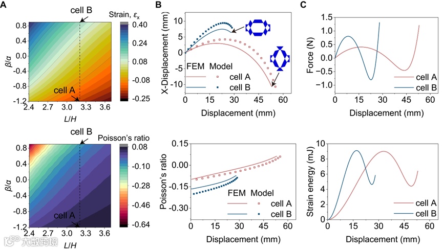 本文开发的剪纸拓扑图案融合了正负泊松比的机构学元素,同时结合了基于几何不兼容性的双稳态设计。剪纸单元通过几何参数调节实现了两种机构运动的互竞效果,使结构整体变形可以分别趋向于负泊松比或正泊松比,如图2所示。文章通过建立运动学模型,进一步分析了轴向运动剪纸单元的泊松比调节过程,并将运动、变形过程与稳态特性进行了解耦设计,使具备不同变形特征的剪纸单元能够保持相同的能量势垒。