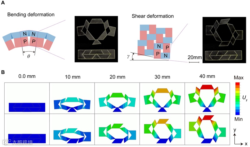 团队进一步拓宽了剪纸结构的平面变形功能。研究发现,结构产生弯曲或剪切变形模式可以通过在单元内部不同位置配置差异化的泊松比实现,见图3中的计算结果。此时无需施加弯矩或剪力,仅通过结构在拉伸载荷下的不均匀变形,即可实现平面多模式运动效果,同时依然保持双稳态特性。