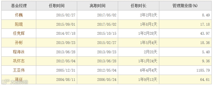 金牛理财网数据显示,华夏大盘精选混合基金现任基金经理是陈伟彦,历任基金经理有8位,管理基金时长1-7年不等。其中曾经的“公募一哥”王亚伟为华夏大盘精选30倍的回报率打下了坚实基础,在他任职的6年多时间(2005年12月31日-2012年5月4日),管理期业绩达到1186.79%,累计回报率接近12倍。