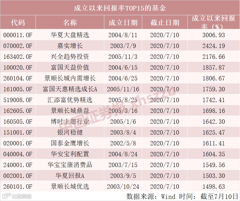 Wind数据显示,截至7月10日,成立逾15年的华夏大盘精选混合基金复权单位净值增长率达到3006.93%。