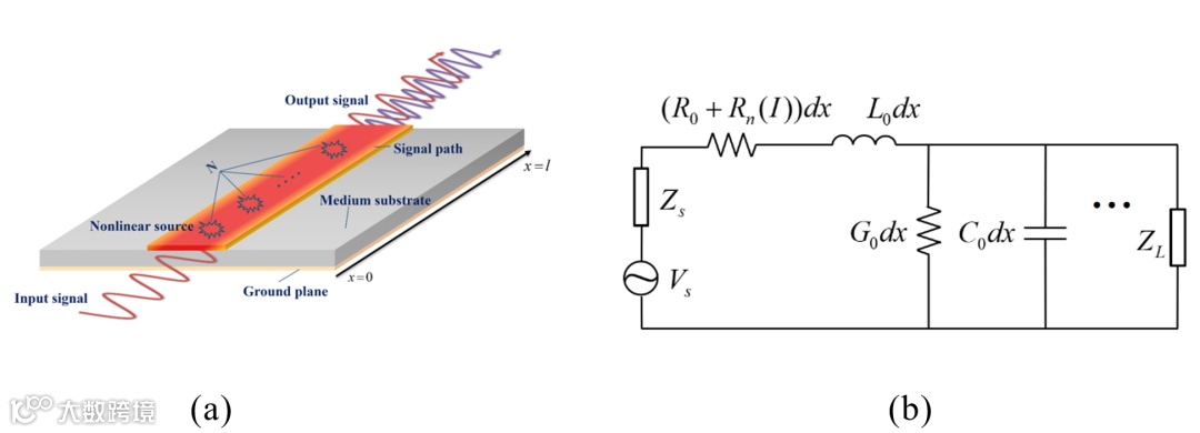 图1 (a) 微带传输线的非线性作用机制 (b) 非线性微带传输线模型