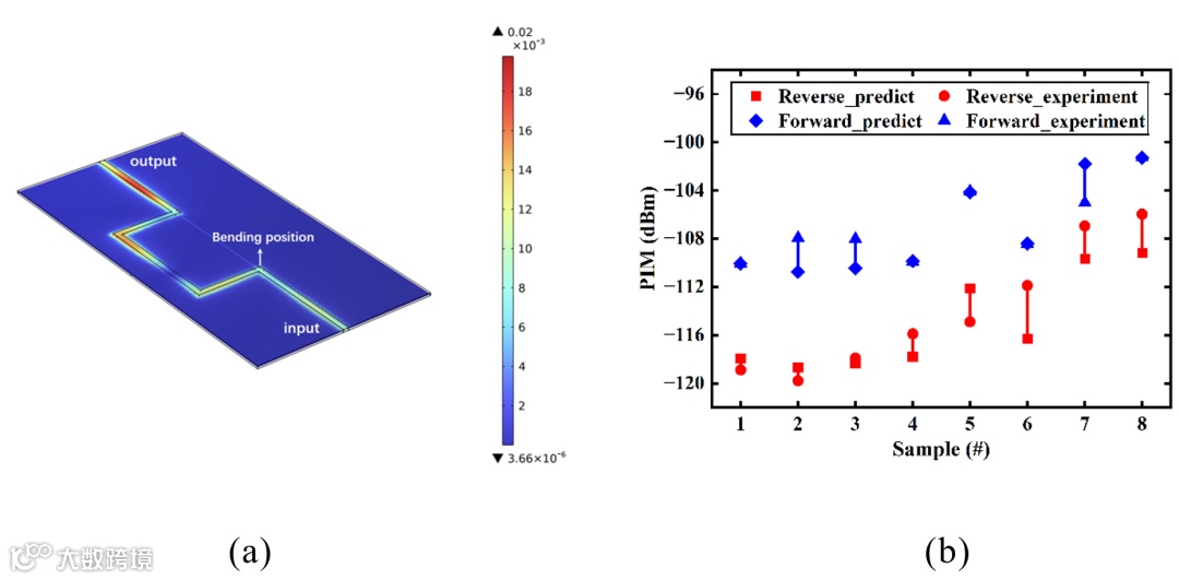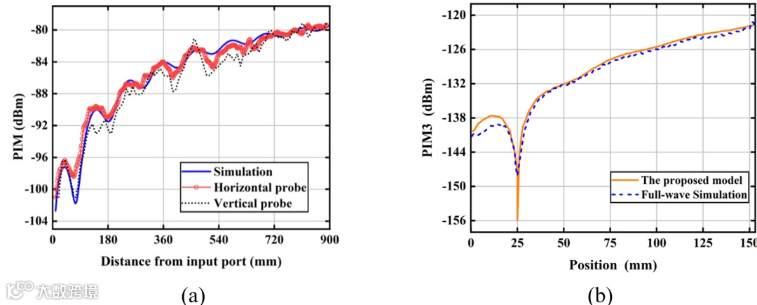 图2 (a) PIM近场分布测试验证 (b) COMSOL与数值模型求解的直微带线PIM分布