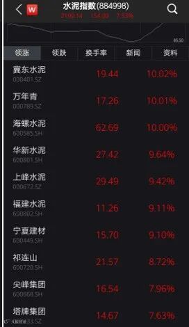 水泥板块中,冀东水泥、万年青、海螺水泥集体涨停。