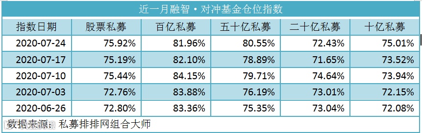 除融资客持续加仓外,私募也在7月份加仓明显。私募排排网组合大师数据显示,截至7月24日,股票私募整体仓位指数为75.92%,环比前一周加仓了0.73个百分点,其中53.64%的股票私募仓位超过八成,仅15.32%的股票私募仓位低于五成。分规模来看,五十亿股票私募加仓幅度最大,近一年仓位指数首次突破80%,环比加仓了1.66个百分点;百亿私募私募占比为66.76%。