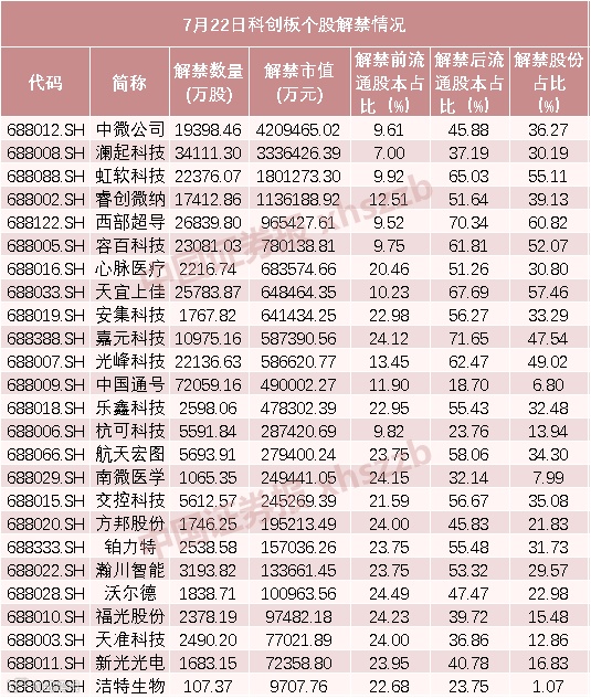 中微公司是这批公司中解禁市值规模最大的,7月22日有1.94亿股股份解禁。以7月21日收盘价计算,解禁总市值合计420.95亿元,公司现有流通市值为112亿元。