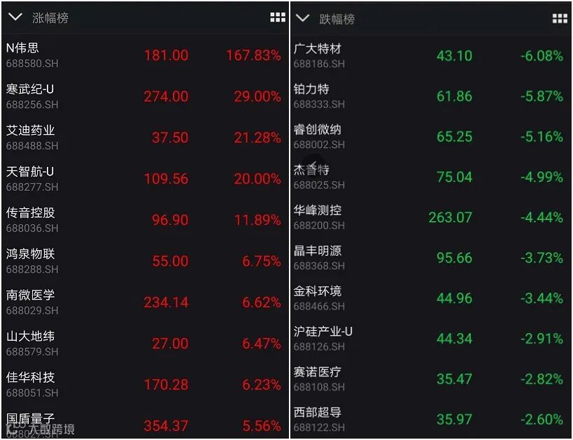 今日,133只科创板股票有80只股价收涨,其中13只涨幅在5%以上,新上市的伟思医疗大涨167.83%,寒武纪大涨29%。广大特材、铂力特、睿创微纳等个股跌幅居前。