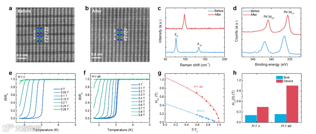接着,研究团队对合成后的PdTe薄层进行了表征(图2(a)-(d)),剖面扫描透射电子显微镜(STEM)图像、X射线光电子能谱(XPS)以及拉曼(Raman)光谱均显示PdTe2薄层已经完全转化为高质量的PdTe薄层。输运测量结果显示,56nm厚的PdTe器件的超导临界转变温度约为3.2 K,低于同样电化学方法合成的PdTe块体材料的4.4 K,图2(e)和(f)分别为磁场平行于c轴和平行于ab面时不同磁场下随温度的变化。如图2(g)所示,上临界场随温度变化符合二维Ginzburg–Landau (GL)公式拟合,这表明PdTe薄层具有二维超导特性。同时,其上临界场的大小和各向异性较块体显著增强,进一步表现出明显的二维超导特性(图2(h))。