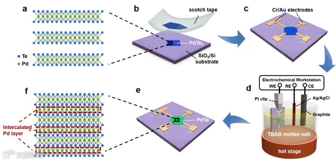图1. 原位电化学合成PdTe薄层器件的示意图。