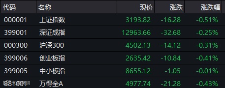 截至午间收盘,上证综指下跌0.51%,报3193.82点;深证成指下跌0.25%,报12963.66点;创业板指下跌0.41%,报2635.42点。