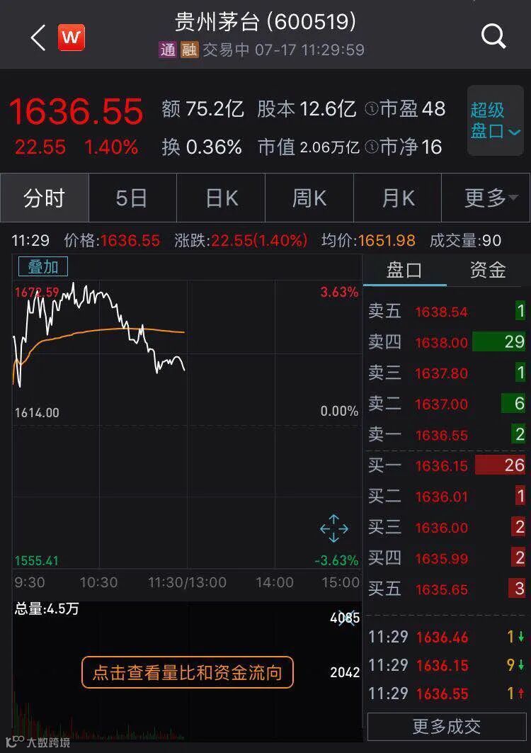 第二个现象是,贵州茅台今天上午上涨1.4%,昨天则大跌7.9%。