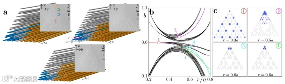 图1. (a)第3代谢尔宾斯基垫片波导阵列结构,蓝色和橙色分别对应第1代和第2代分形结构,插图为实验室制备的样品。(b)频谱。(c) 角态。