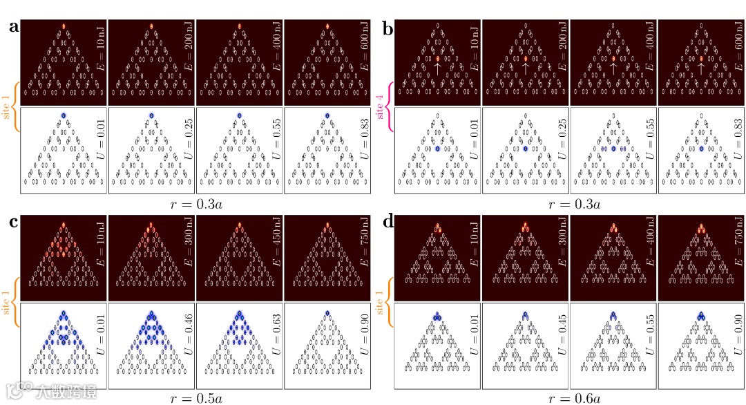 研究人员在同时存在非线性和局域角态的分形阵列中,利用牛顿迭代法得到了相应的无阈值拓扑角态孤子族。并证明了无阈值角态孤子的局域化与非线性传播常数之间的依赖关系,发现随着功率的快速增加,孤子逐渐变宽,局域化减弱,当传播常数到达扩展态的边界时,孤子可能会扩散至整个波导阵列。