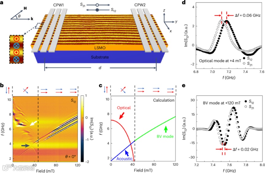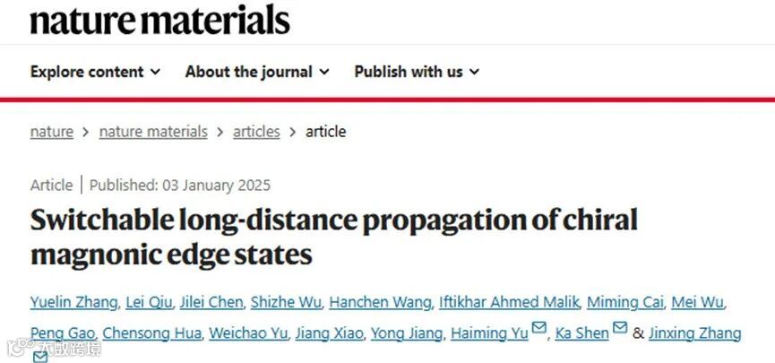 近期,北京师范大学沈卡、张金星教授以及北京航空航天大学于海明教授合作在Nature Materials期刊上发表了题为「Switchable long-distance propagation of chiral magnonic edge states」的最新论文。他们报道了在锰酸盐薄膜中实现室温长距离传播的手性磁振子边缘态。这些薄膜具有长距离反铁磁耦合的自旋螺旋(毫米级长度)和低磁性吉尔伯特阻尼(约3.04×10⁻⁴)。本研究通过直接观察非互易性自旋波传播和分析螺旋纹理中的强磁振子耦合,作者阐明了动态偶极相互作用在这种手性磁振子边缘态的产生与混杂中的关键作用。观察到的具有稳健手性的混杂磁振子可以通过外场下的不同阈值角度可逆地选择性开/关,表明其在纳米级多功能磁振器器件设计中的巨大潜力。