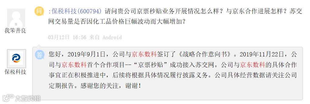 据了解,2019年9月1日,保税科技与京东数科签订了《战略合作意向书》。2019年11月22日,保税科技与京东数科首个合作项目——“京票秒贴”成功接入苏交网。保税科技是一家集码头仓储业务、智慧物流电商平台和供应链金融服务为一体的创新型综合物流服务商。